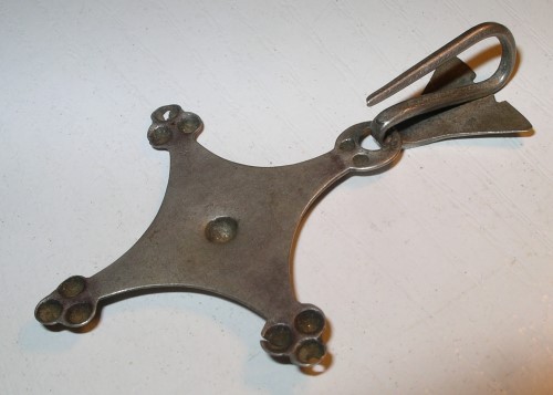 Old Tuareg back pendant "schirot" with original suspension from leather. Front side manufactured from silver sheet, rear side of sheet iron. Rattle sheets made of tin andBack 3 french coins dating 1924, 1937 und 1938. Dimensions (HxBxT): ca. 123x165x6 mm. |