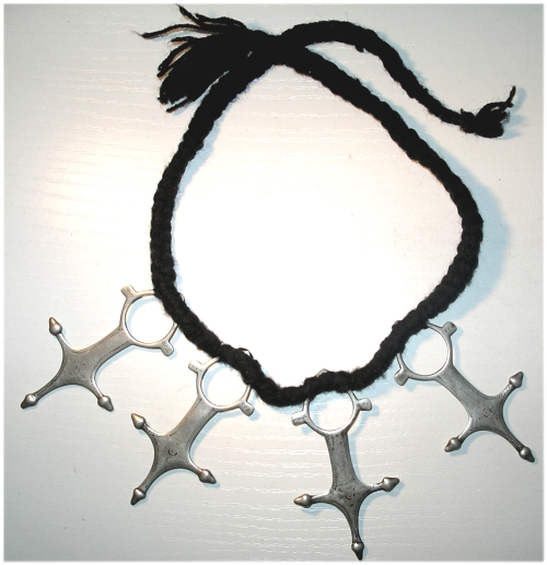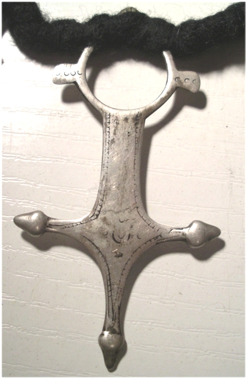 4 old Agadez crosses made of good silver, pulled up on a black wool string. In this way they were frequently used around the neck by the women of the eastern Awelimmiden tribes as ornament and traditional payment. The wool string is torn in half. Dimensions of single cross (HxB): ca. 75x40 mm |