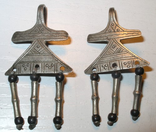 AFRICA: Old tuareg ear pendants made of silver. The front is decorated with the typical Tuareg engraving work. Dimensions (LxB): ca. 67x45 mm, Total Weight (both): 12,1 g |