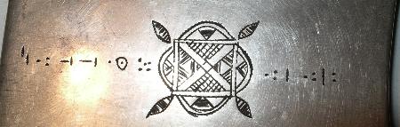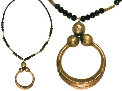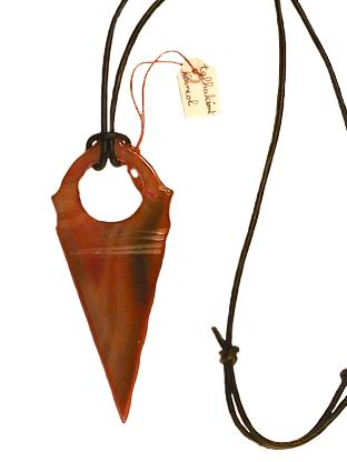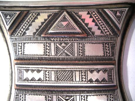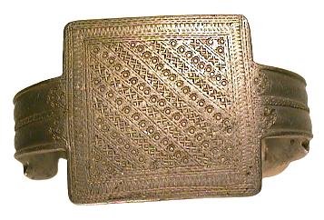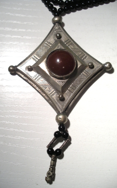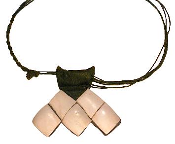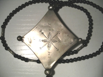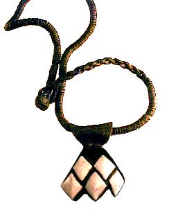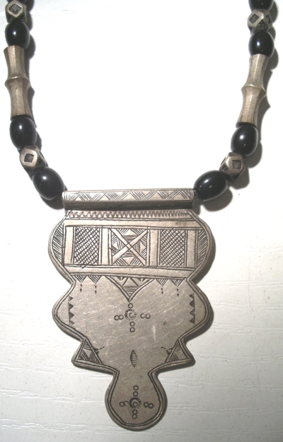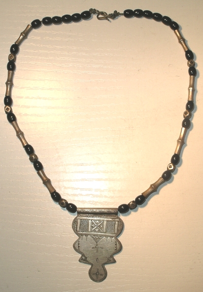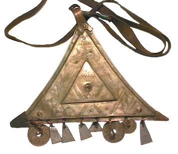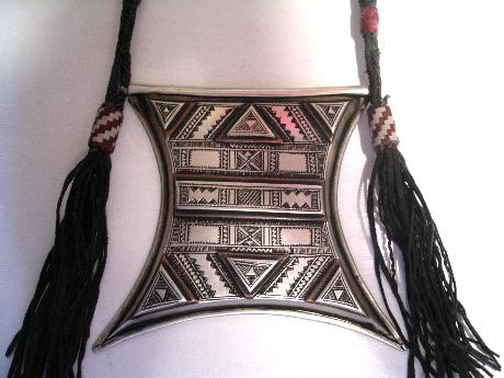 The "chomeissa", a typical woman ornament of the Tuareg and Bella tribes. The pendant consist of 5 shell- or bone plates sticked on the leather pendant. This ornament for a Targia is so important, that an idiom says, she would prefer to go naked, than without a "chomeissa". |