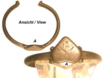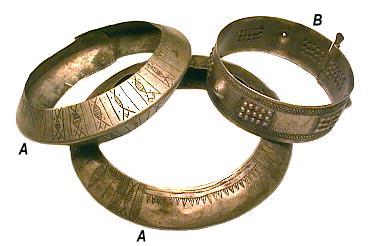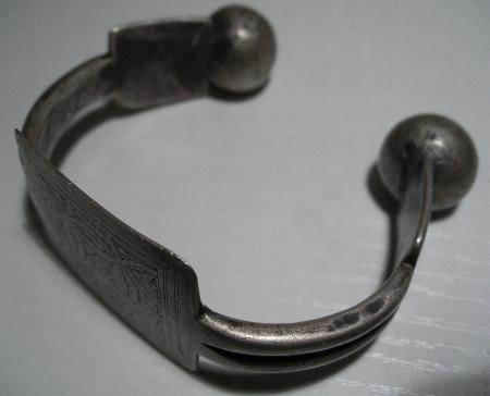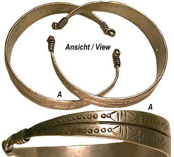 Bracelets made of silver metal, partial covered with rune similar signs. Some show inscriptions of the manufacturer/owner? Today these bracelets are not produced any more! Outer diameter from 70 to 85 mm. Weight: ca. 20 g |
