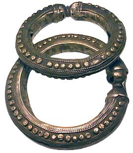 Ethiopia, Rashaida armlets of silver metal. Above, outer/inner diameter: 95/66 mm Weight: 51,8 g Down, outer/inner diameter: 108/70 mm Weight: 65 g |
