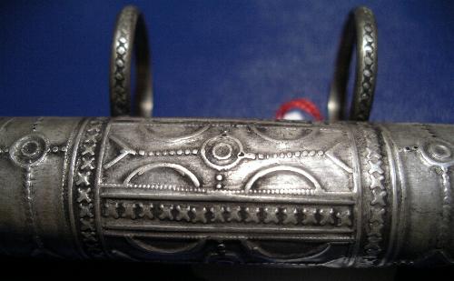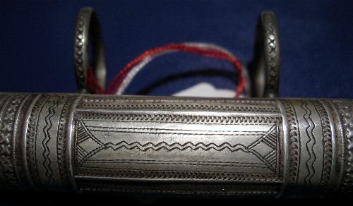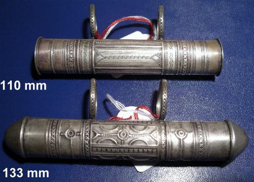 2 old tuareg amulets type "corcoro". These amulets are worn by men of Tuareg Tribes in the Air mountain region. These amulets are consisting of good silver and are decorated with the typical Tuareg engraving work. Measurements (LxD): upper ca. 110x20/23 mm, down ca. 133x21/23 mm Weight: upper ca. 40,5 g down ca. 45,7 |