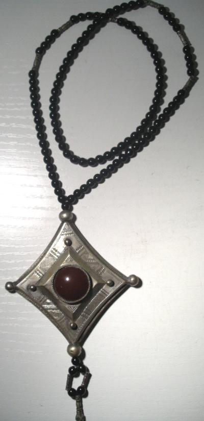 AFRICA: Typical talisman box, "tcherot", as used by women and men of the Kel Air and Fulani tribes. The pendant has centrically a dark brown inlay from glass or dyed stone. The backside ist signed with "tifinagh" inscription. The necklace is made of beads (ca. 4 mm) from black glass- and long silver beads (ca. 11 mm) type "ismana". Dimensions (BxH): Pendant ca. 75x81 mm, Necklace length (single length): 600 mm Weight: 61 g Necklace cannot be opened. |