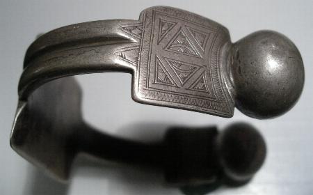 The carnelian pendant "tanfouk" will be used of almost all tuareg tribes. The first pendants came from India and later, up to the 20th century A.D., were also produced in Idar Oberstein, Germany. The pendants were manufactured in different sizes. They were carried mainly as chest- and hair ornament. Dimensions (HxBxT): ca. 112x48x4,5 mm Weight: ca. 27 g |