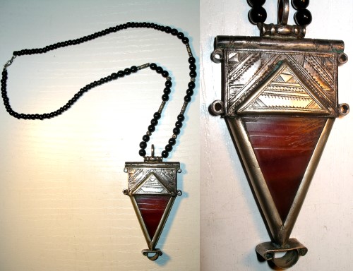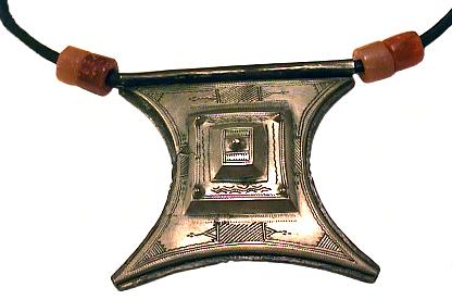 Talisman box, "tcherot", as used by women and men of the Kel Air and Fulani tribes. Front side manufactured from silver sheet, rear side of sheet iron. Adjustable leather suspension with 4 neolithic carnelian beads. Dimensions (HxBxT): 61x62x11 mm, pendant ca. 90x100 mm, |