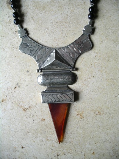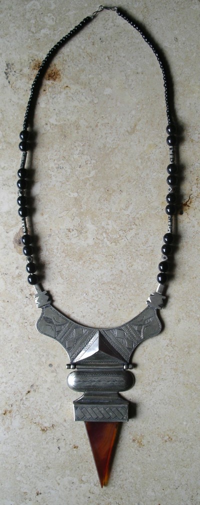 Old tuareg necklace with a "tanfouk" tip made of brown carnelian/agate, mounted in silver. The pendant is decorated with the typical Tuareg engraving work and signed on the back in "tifinagh". The necklace consists of black glass beads (3,5 and 4 mm), long silver beads "ismana" (ca.11 mm) and octaeder beads (2,5 mm) of silver. Dimensions (LxBxT): Pendant ca. 73/87x45x9 mm, Necklace length (single length): ca. 495 mm Total Weight: ca. 52,1 g You can open the necklace. |
