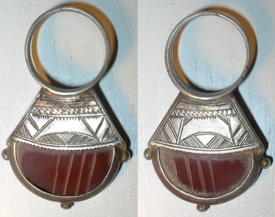 Large "tisek" ring with carnelian "tanfuk" stone made of silver. These rings are spread to all Tuareg tribes in most various types. They will be used as fingerring, hair ornament, pendants and even as toe rings. Measurements (LxBxT): 55x35x11 mm Ring inner diameter: ca.20 mm Weight: ca. 16 g. very nice work! |