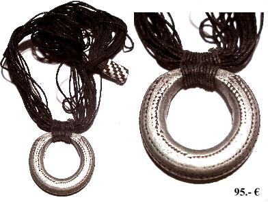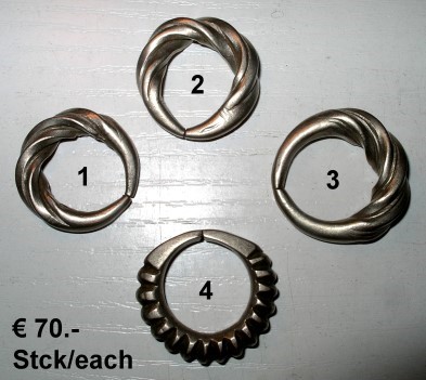 Rings- ring pendants of silver, as mostly worn by the Kanuri-Shuwa- and Fulani tribes. These rings will be used as pendant, fingerring, toe ring and as hair ornament by women and men. Outer diameter: 30-40 mm. Weight: 12-38 g |