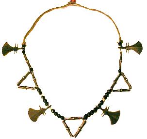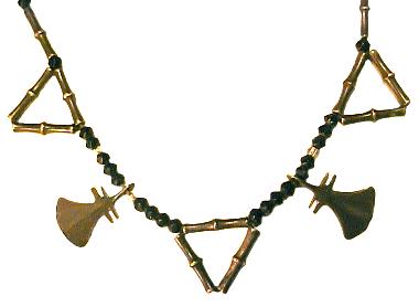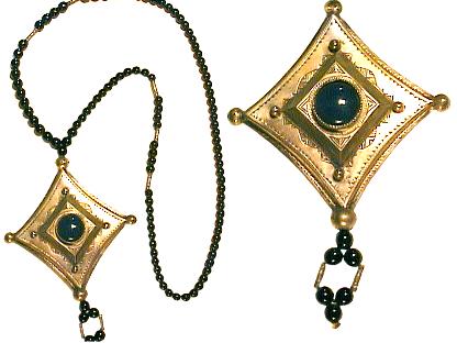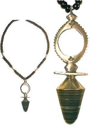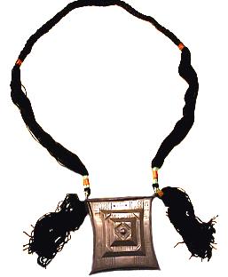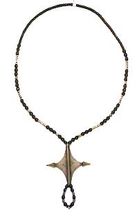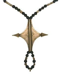 Necklace with pendant made of silver alloy with a pendant in shape of a "zinder cross" (these crosses are used for small payment of the tuareg tribes) The down part of the pendant is made in sandwich technic, wood-metal. The necklace consists of black glass beads (ca. 5,5 mm), long silver beads "ismana" (ca. 12 mm). Dimensions (LxBxD): Pendant ca. 76x28,5x1/6 mm, Necklace length (single length): ca. 510 mm Total Weight: ca. 60 g You can open the necklace. |