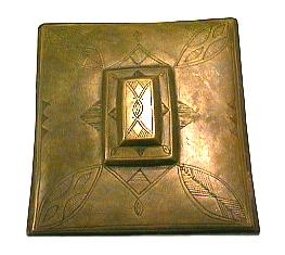 Upper: Turban talisman box, "tcherot". Front side manufactured from brass sheet, rear side of sheet iron. Rare! Dimensions (HxBxT): 74x67x9 mm Down: Turban talisman box, "tcherot". Front side manufactured from silver sheet, rear side of iron sheet. Rare! Dimensions (HxBxT): 59x63x7 mm |