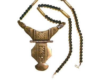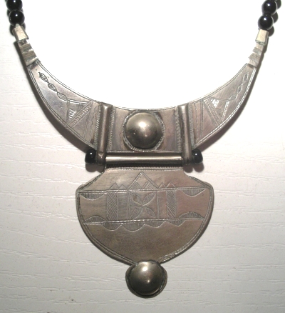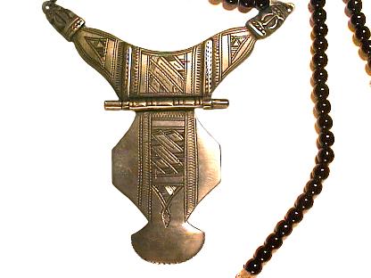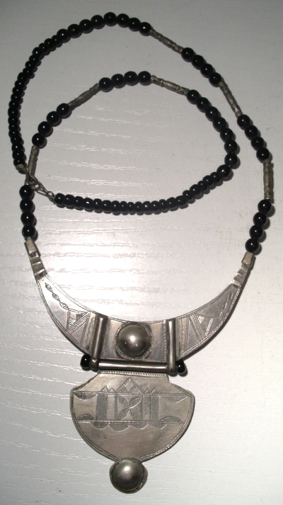 Typical necklace, type "takassa", of the Kel Air Tuareg with long silver beads "ismana" and a centric silver pendant "lahia". Others with black glass beads. You can open the necklace. |
