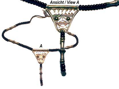 AFRICA: Girls necklace of Ullimeden Tuareg, type "chatchat". Ornamented silver pendants, black octaeder glass beads (with some clear glass beads) and long silver beads (16 mm) "ismana", put together to triangles. Dimensions (LxB): Silver Pendants ca. 23x14 mm, Necklace length (single length) ca. 310 mm Total weight: 10,7 g You can open the necklace. |