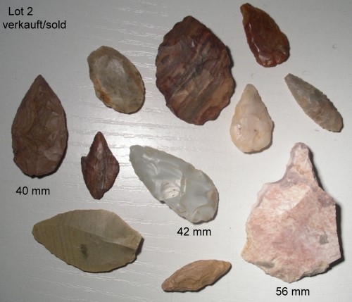 Gezähnte Pfeilspitzen aus Jaspis und Chalcedon Länge: von 22 bis 42 mm, Pos. 9.12+9.13 sind sehr fein gezähnt. |