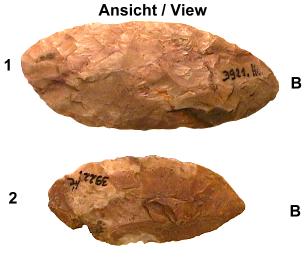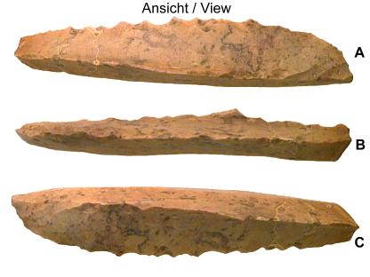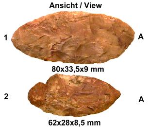 Prehistoric Artifacts as flakes, knifes, drills and others, made out of "Impact Glas". This material was formed during an impact of a meteorite, known also as "Libyan Glass". Like Obsidian, a volcanic glass, it was used in prehistoric times for the production of tools, weapons and jewellery. Length: from 26 up to 66 mm |