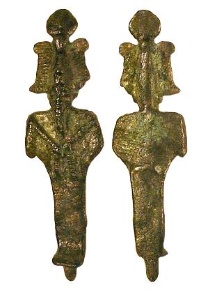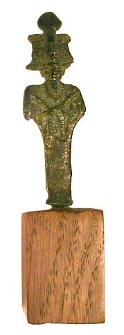 Small figure OSIRIS, made of bronze, stable patina. Cultural Period: Ca. 4th-6th century B.C. Dimensions (HxBxT): 80x21xca.7,5 mm Weight: 22,6 g Above on the right over the right ear, small piece is missing, otherwise intactl The figure is delivered on a small wood pedestal. |