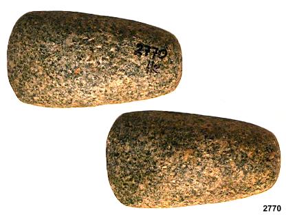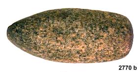 Walzenbeil 2.2770 aus Granit, grün-weiß gesprenkelt, Beil wurde als Mörser verwendet. Länge: 71,5 mm Gewicht: 144 g |
