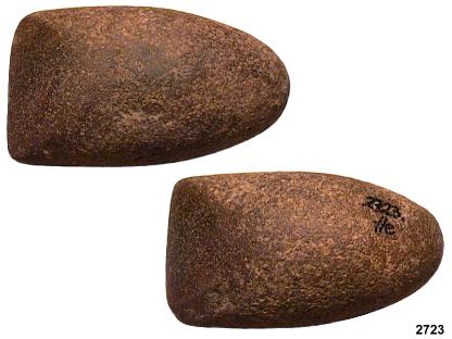 Walzenbeil 4.2723 aus Jaspis, rotbraun. Schneidenflächen hochglanz poliert. Länge: 78,5 mm Gewicht: 180 g |