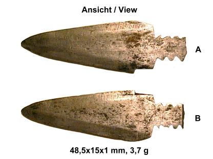 Historische Pfeilspitze der Indianer, Typ "Trade Point", hergestellt aus einer alten Stahlschraube, ca. 170-450 Jahre alt. Diese Art Pfeilspitzen wurden von Franzosen und Englädern von 1600 bis etwa 1800 u.Ztr. mit den Indianern gehandelt, daher die Typbezeichnung "Handelsspitze". Sie waren aus Kupfer, Eisen und Stahl, vorl. Spitze ist aus Stahl. |