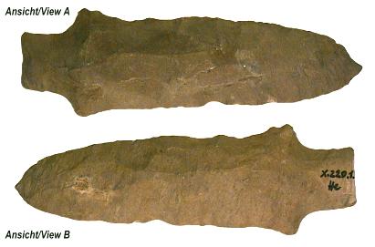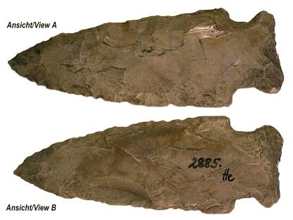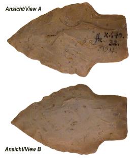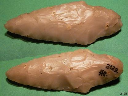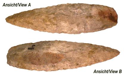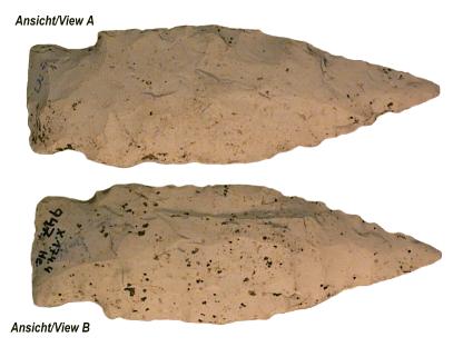 "ETLEY" aus Mill Creek Chert, weiss-beige, leicht rosa. Qualität: G8 Kulturperiode: LATE ARCHAIC, 4000-2500 B.P. Abmessungen (LxBxD): 112x37x10 mm. Gewicht: 44,9 g |