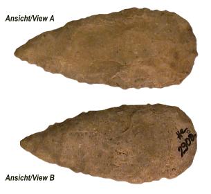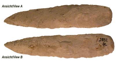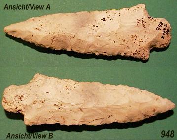 "ETLEY" aus Mill Creek Chert, weiß. Qualität: G7. Kulturperiode: LATE ARCHAIC, 4000-2500 B.P. Abmessungen (LxBxD): 106x34x11 mm. Gewicht: 43 g |