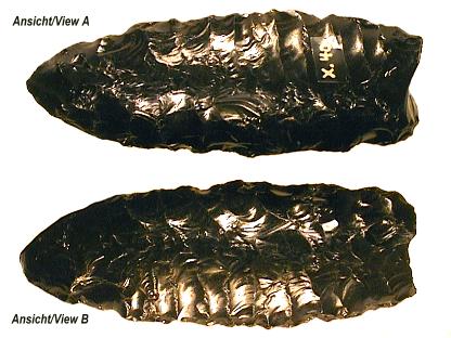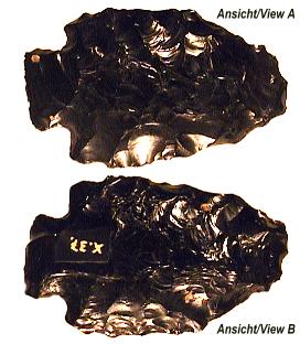 "SPITZE" aus Obsidian, schwarz, glänzend. Qualität: G 5, prähistorische Spitzen- und Seitenabsplitterung. Kulturperiode: COLIMA, 300 v.Chr.-500 n.Chr. Abmessungen (LxBxD): 52x32x9 mm. Gewicht: 15 g |