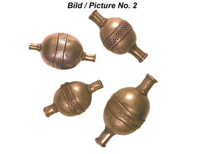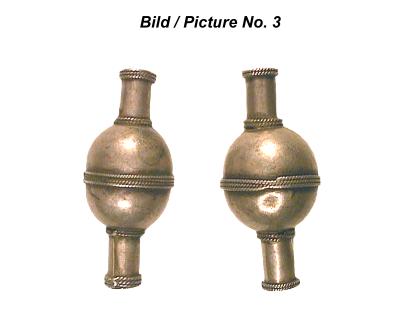 Alte turkmenische Silberperlen aus Afghanistan, um 1900 u.Ztr. Abmessungen (LxD): von 55x26 mm bis 69x33 mm Gewicht: von 29,2 g bis 14,3 g |
