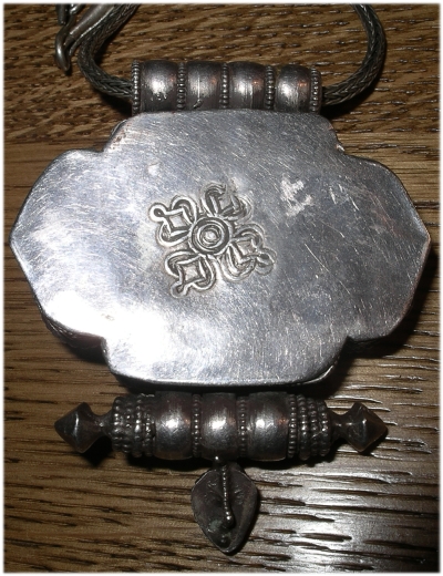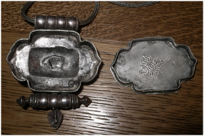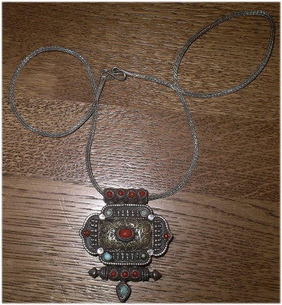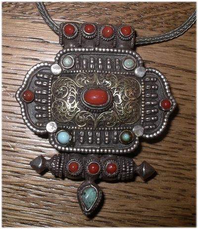 Alte Anhängerkapsel (kann geöffnet werden) mit Silberkette aus dem Himalaya (Tibet). Aufwendige, feine Arbeit aus Silber und (mittig) Gold? mit Türkisen, Koralle und anderen Steinen. Abmessungen: Anhänger (HxBxD) ca. 60x50x10/13 mm Länge der Kette: ca. 570 mm Gesamtgewicht mit Kette: ca. 50 g |