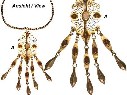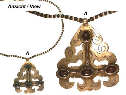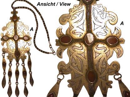 Alter Schmuck aus Turkmenien. Kette mit Silberanhänger und eingefassten Karneolen. Die Silberoberfläche des Anhängers ist teilweise feuervergoldet Kette ist fertig konfektioniert zum Tragen. Abmessungen: Anhänger (HxB): 240x83 mm Kettenlänge: 410 mm Gesamtgewicht: 136 g |