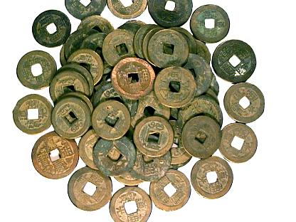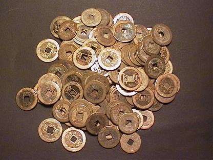 China-Käsch (-Cash) oder Lochmünzen (Keine Repliken!). Ching Dynastie, 18. Jahrhundert u. Ztr., Kaiser Chien Lung u.a. Abmessungen: von 20 bis 25 mm Gewichte von 3,4 bis 4,4 g |