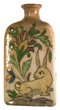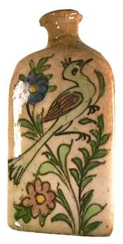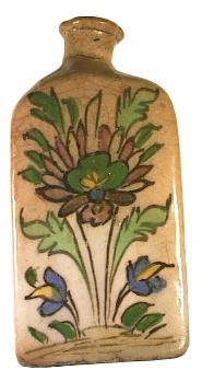 Dreikantige Flasche aus Persien, polychrome Glasur. Alle 3 Seiten zeigen die verschiedenen, abgebildeten Motive. Die Flaschen sind etwa 150-200 Jahre alt und sind nach dem Vorbild der KAZAR Keramik des 17.Jahrh. u.Ztr. hergestellt. Abmessungen (HxB): 184x88/92 mm Gewicht: 490 g |
