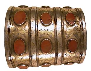 Alter Schmuck aus Turkmenien. Armreif aus Silber mit 12 Stück eingefassten Karneolen. Die Silberoberfläche des Armreifes ist teilweise feuervergoldet. Abmessungen: Länge: 84 mm Außendurchmesser: 72/65,5 mm Innendurchmesser: 61,5/48 mm Gewicht: 235 g |