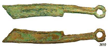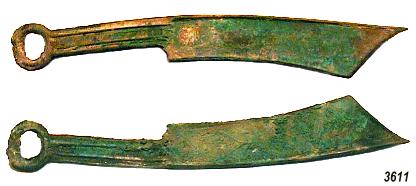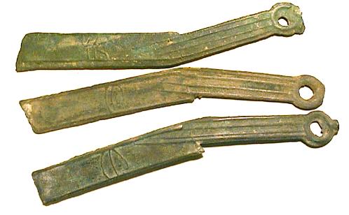 Messermünze aus Bronze. Ming Serie, Typ "youanbei mingdao". Unterschiedliche Münzstätten, ab zweiter Hälfte 5tes Jahrhundert vor Chr. Längen, 135-137 mm, Gewichte, ca. 15,3 - 16,3 g |