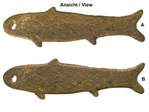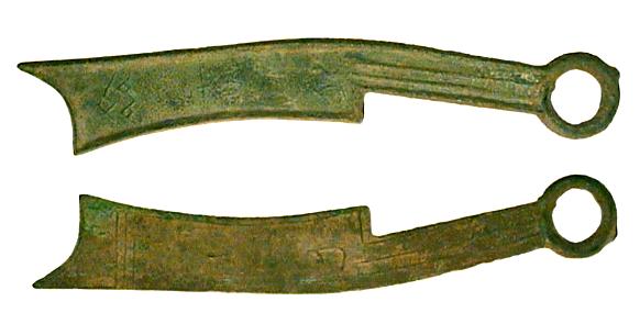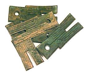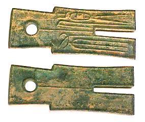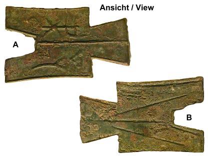 Fischmünze aus Bronze, beidseitig mit Schuppenmuster. Chou Dynastie, 8.- 5. Jahrh. v.Chr. Abmessungen: ca. 107x31x2 mm Gewicht: 29,2 g |