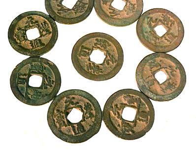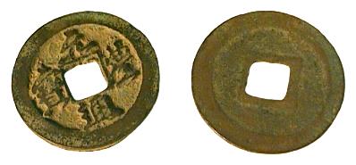 Einseitig beschriftete Lochmünzen der Sung Dynastie. Kaiser Shen Tsung, 1068-1085 u. Ztr. Name: Yüan Feng Titel: Tung Pao Abmessungen: ca. 23,3x0,6 mm Gewicht: ca. 3,9 g |