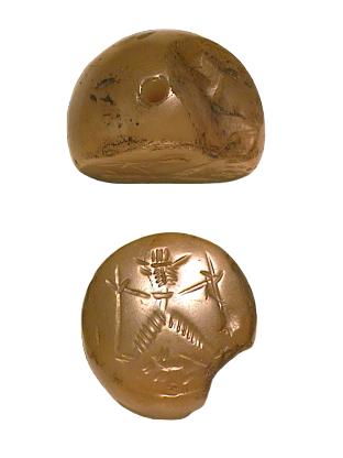 Sassanidische Siegelperle aus Achat. Neupersisches Herrschergeschlecht von 224 bis ca. 642 n.Chr. Abmessungen (DxH): 26,5/28x22 mm. Gewicht: 24,9 g Seitenausbruch |