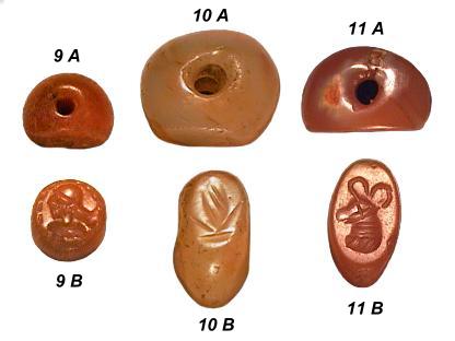 Sassanidische Siegelperlen aus Achat. Neupersisches Herrschergeschlecht von 224 bis ca. 642 n.Chr. Abmessungen (DxH): 9.) 12/10x9 mm. Gewicht: 2,1 g 10.) 17/9x15 mm Gewicht: 3,9 g 11.) 18,5/9,5x12,5 mm. Gewicht: 3,2 g |