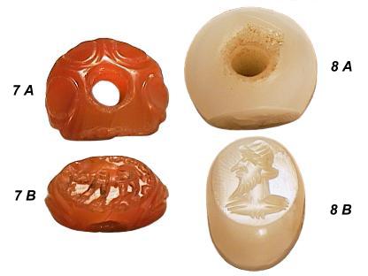 Sassanidische Siegelperlen aus Achat. Neupersisches Herrschergeschlecht von 224 bis ca. 642 n.Chr. Abmessungen (DxH): 7.) 19/10x15,5 mm. Gewicht: 4,4 g 8.) 22/15x19,5 mm Gewicht: 10,6 g Nr. 7 aus rotem Karneol ist einem Seeigel, der Ordnung Echinacea nachempfunden! |