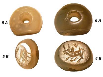 Sassanidische Siegelperlen aus Achat. Neupersisches Herrschergeschlecht von 224 bis ca. 642 n.Chr. Abmessungen (DxH): 5.) 18/12,5x15 mm. Gewicht: 5,8 g 6.) 25/18x20 mm Gewicht: 13,2 g |