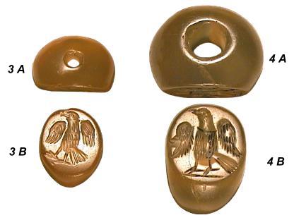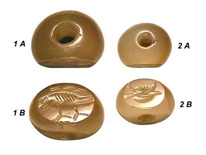 Sassanidische Siegelperlen aus Achat. Neupersisches Herrschergeschlecht von 224 bis ca. 642 n.Chr. Abmessungen (DxH): 3.) 17/13x11,5 mm. Gewicht: 3,9 g 4.) 23/16x18,5 mm Gewicht: 10,9 g |