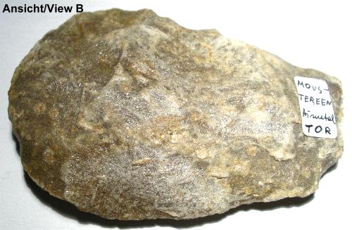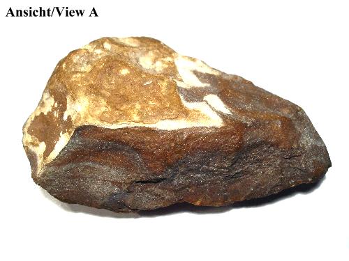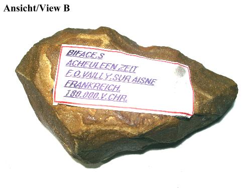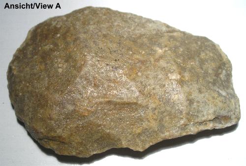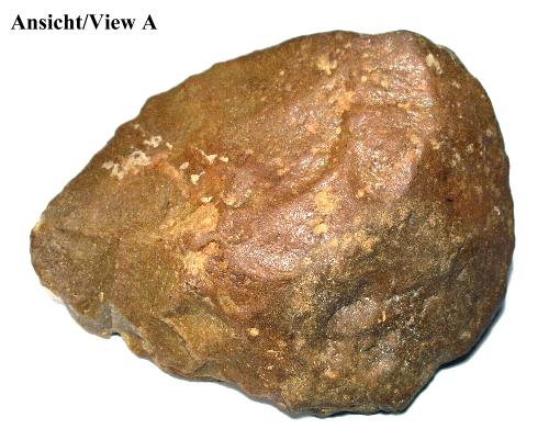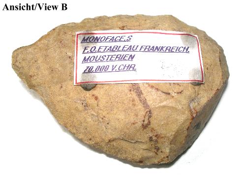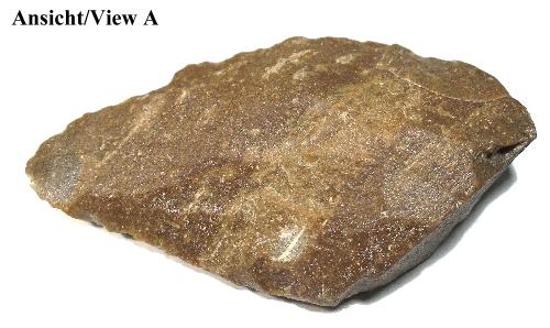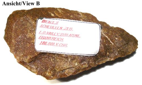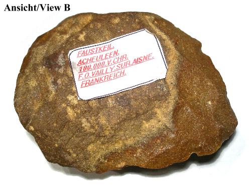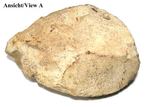 Nr.1967, Frankreich, Faustkeil/Schaber aus sehr feinem Quarzit (Jaspis?). Ventral mit erkennbarem Schlagauge und sehr schön retuschierter Arbeitskante (oberhalb des Schildes), seitlich eine definierte Handschutzfläche (Schlagbasis). Ventral schöne Glanzpatina. Abmessungen (LxBxD): 107x76x27 mm Gewicht: Gewicht: 210 g |