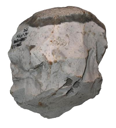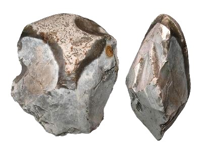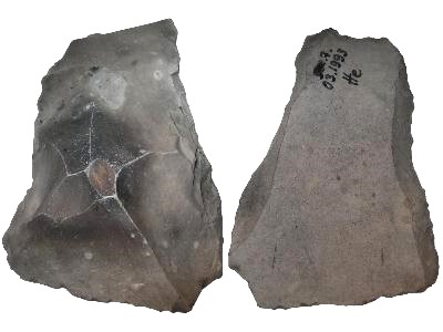 Nordic Chopper (Pepple Tool), made of an Silex Pepple. The artifact dates from a nordic site from where scientific acknowledged hand-axes (bifaces) are found. The handle surface for the palm consists of the smooth cortex of the Silex pepple. Paleolithicum. Measurements (LxBxT): ca. 84x74x46 mm Weight: 280 g Complete History! |