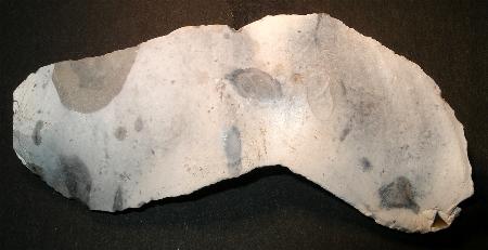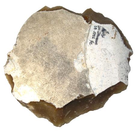 Some very special ! Disc shaped artifact from pale brown Silex with beautiful crystal inclusions. The Silex is slightly transparent. This artifact is presumably a Weapon, a throwing disc, jagged, with still very sharp edges. The handle surface to throw him without own injury is present. This artefact group is discussed controversially, however, shows always the same attributes in various countries: (own experience, proofed by many own findings) All of them could be thrown with one hand, so they have a limited size, are disc shaped and are jagged (have sharp points). Further on, they always have a handle surface at the edge for throwing without own injury. Neolithic Site, presumable older. Measurements: ca. 135x28 mm Weight: 517 g Complete History! |