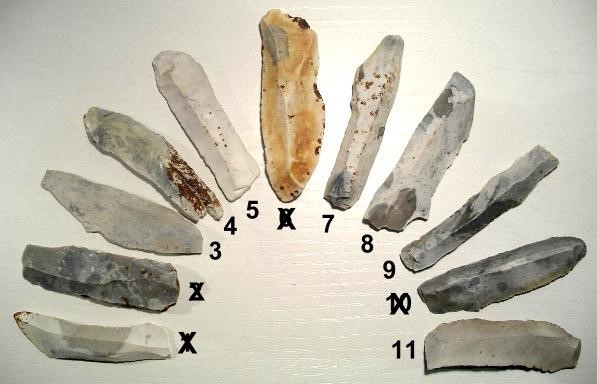 Group of large nordic Flakes/Knifes, made of Silex. Mesolithic, presumable older. The artifacts dates from an underwater find place, therefore a beautiful bluish patina! Measurements (L): from 72 (Nr.1) up to 87 mm (Nr.6) Complete History! |