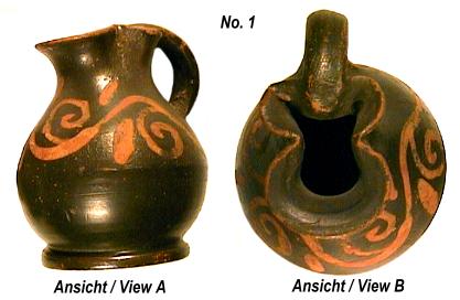 Small "Oinochoe", cloverleaf can, made from beige clay with brown painting. Very good preservation. Measurements: Hight: No.1, 61 mm Weight: Nr.1, 46 g |