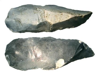 EUROPE: Typical Flake Celt (Scheibenbeil, Spalter), made of a Silex Flake. Mesolithic, presumable older. Measurements (LxBxT): ca. 74x49x17 mm Weight: 71,3 g Complete History! |