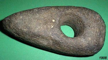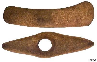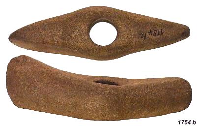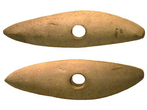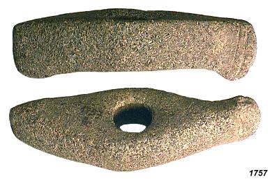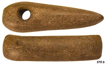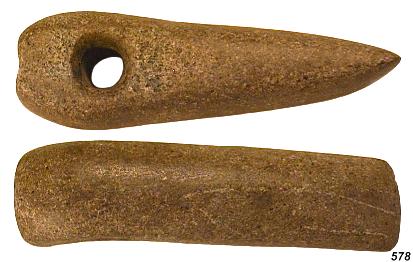 No. 578, drilled axe of granite, younger Bronze Age. Dimensions (LxBxT): 111x35x29 mm Weight: 180 g |