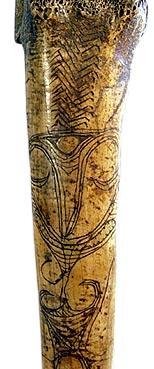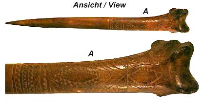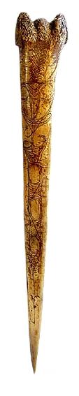 Beschnitzter Knochendolch. Diese Knochendolche, wurden auch als Handels-und Zahlungsmittel verwendet. Lieferung mit Zertifikat und genauer Beschreibung der Herkunft. Gesamtlänge: 400 mm ! Gewicht: 145 g |