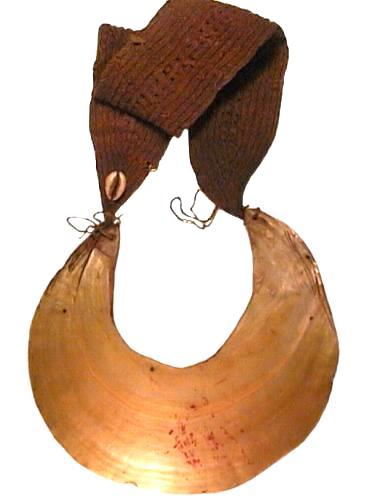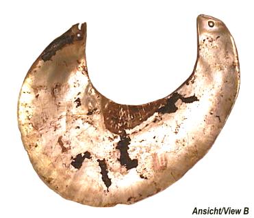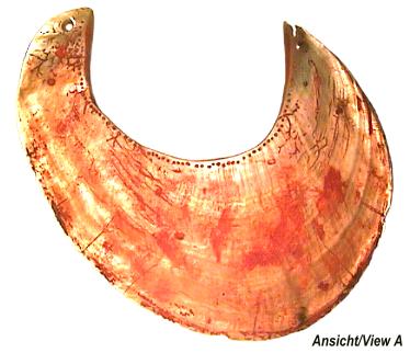 Das Trageband ist ca. 58 mm breit, rot eingefärbt, an einem Befestigungsende ist eine Kaurimuschel angebracht. Auf der Vorderseite sind Reste von roter Einfärbung zu erkennen, ansonsten ist die Muschel naturbelassen. Abmessungen der Muschel (BxH): 175x184 mm. Tragebandlänge: ca. 440 mm. Gesamtgewicht: 240 g |