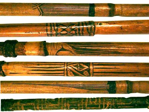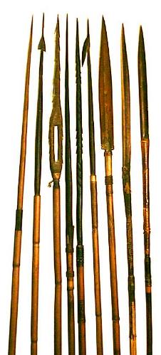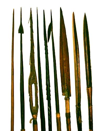 Komplette Pfeile mit Hartholz- und Bambusspitzen geschäftet, kolonialzeitlich, min. 100 Jahre alt. Speergeld, auch Brautpreis. Für einen Speer musste 1964 noch ein kleines Schwein, oder 6 Hühner gezahlt werden. Gesamtlängen: von 1430 bis 1060 mm Gewichte: von 80 bis 27 g |